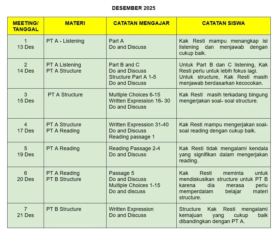 Cek analisis perkembangan belajar melalui catatan yang diberikan pengajar setiap tes dan uji coba peningkatannya dengan preparation Test online