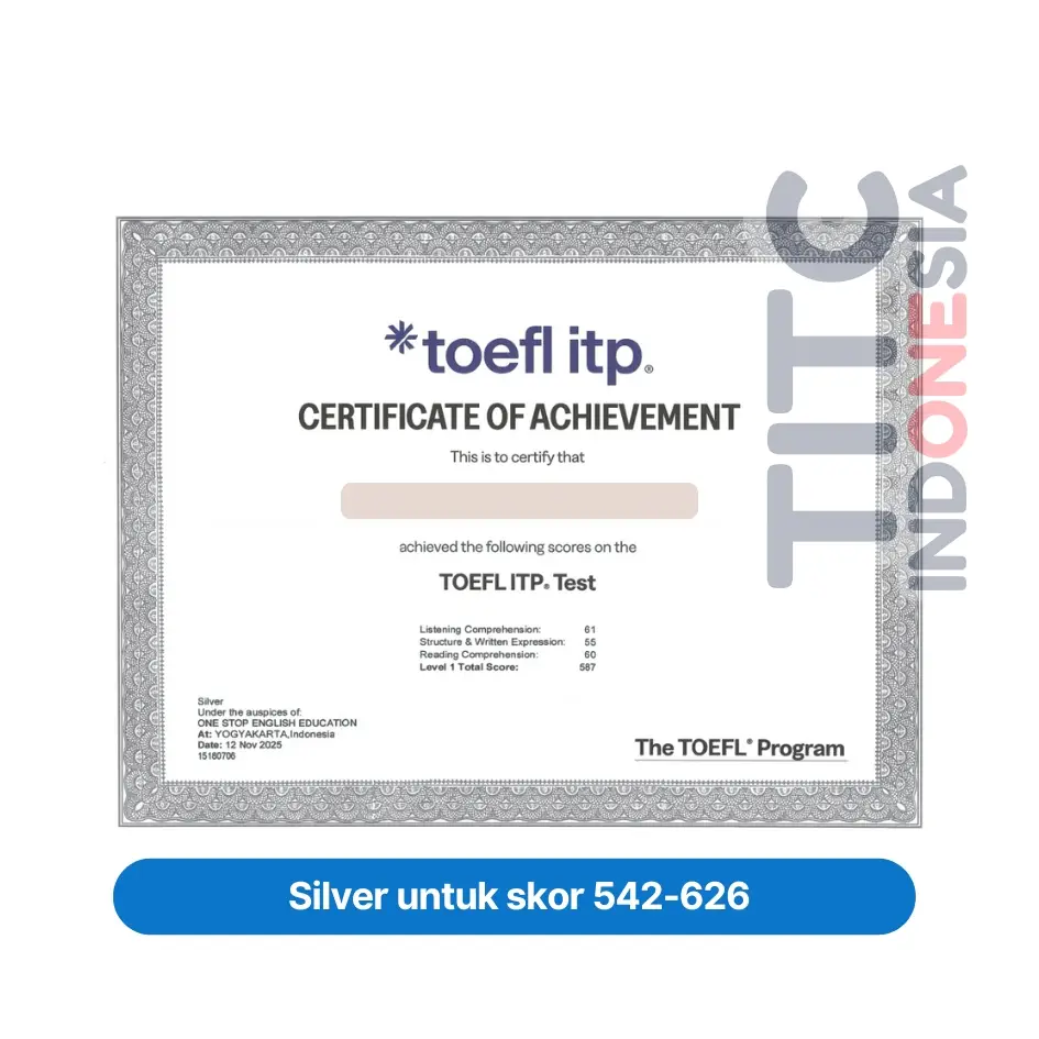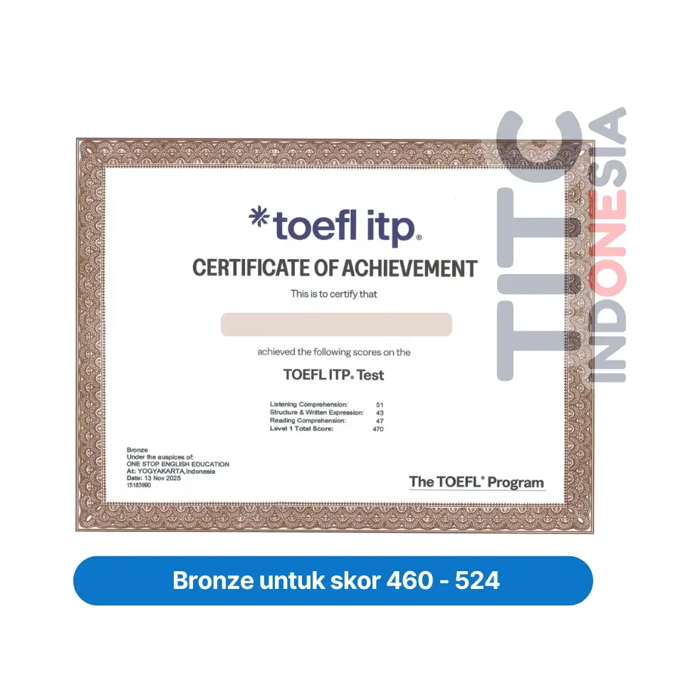 - Certificate of Achievement, berupa sertifikat yang menunjukkan bahwa Test Taker telah berhasil mengikuti tes. Certificate of Achievement HANYA tersedia versi cetak saja di kertas khusus yang berhologram ETS. Pada sertifikat ini akan ditampilkan nama, skor tes, TOEFL® Test Center penyelenggara, tanggal tes dan nomor sertifikat (terletak di bagian kiri bawah). Sertifikat ini valid digunakan untuk semua kebutuhan pemberkasan dalam negeri dengan dibundle dengan TOEFL ITP® Score Report. Certificate of Achievement tersedia 20 hari kerja setelah tanggal tes (diluar weekend dan hari libur). Cek estimasi kedatangan sertifikat disini. Sertifikat hanya akan didapatkan oleh Test Taker yang memiliki skor diatas 433, dibawah 433 Test Taker hanya memperoleh 2 berkas saja yaitu TOEFL ITP® Score Report dan CEFR Score Descriptor.