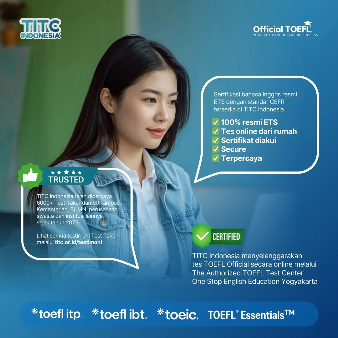 TITC Indonesia menyediakan tes TOEFL ITP® Digital dengan penyelenggaraan tes melalui One Stop English Education, The Authorized TOEFL Test Center resmi ETS yang telah diakui sebagai salah satu Test Center terbaik di Indonesia dengan lebih dari 8000 Test Taker per-tahun. Berikut adalah informasi mengenai tes TOEFL ITP® yang harus diketahui sebelum Test Taker memutuskan untuk mendaftar.