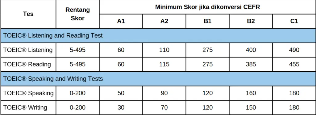 Sistem scoring TOIEC disesuaikan dengan leveling CEFR yang berlaku umum di Eropa dan negara-negara barat dengan standar penilaian sebagai berikut: